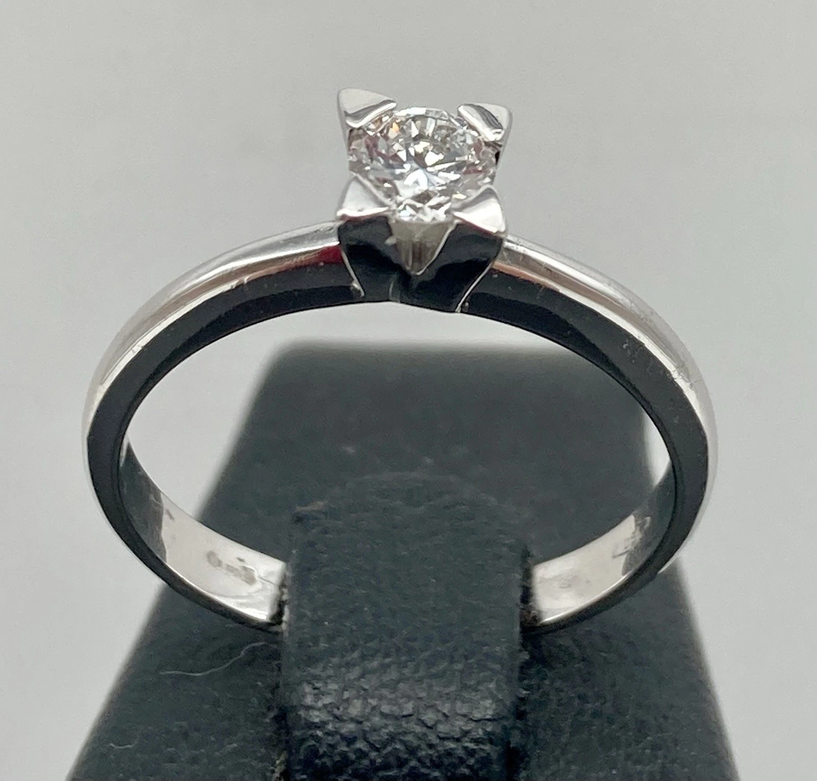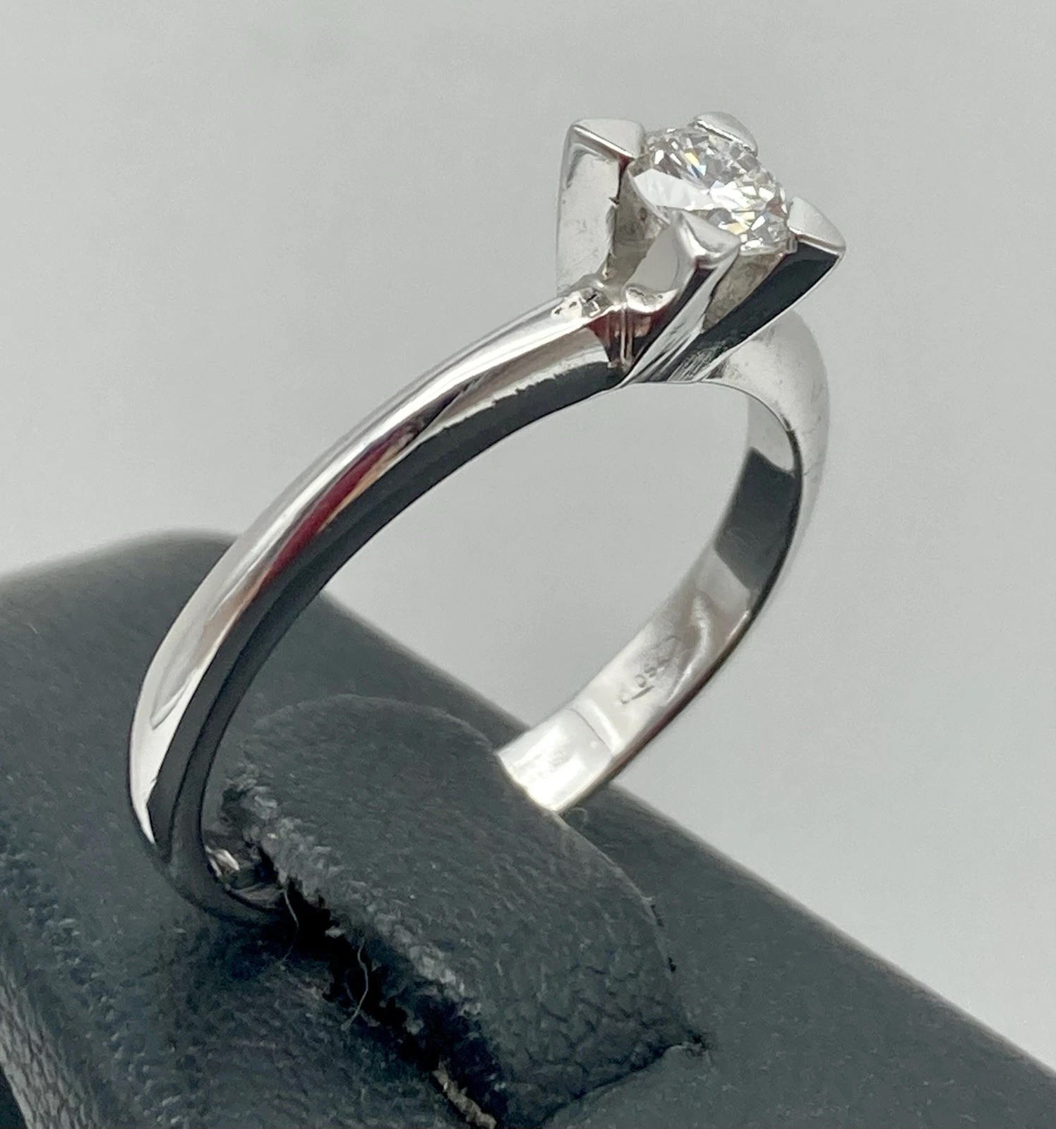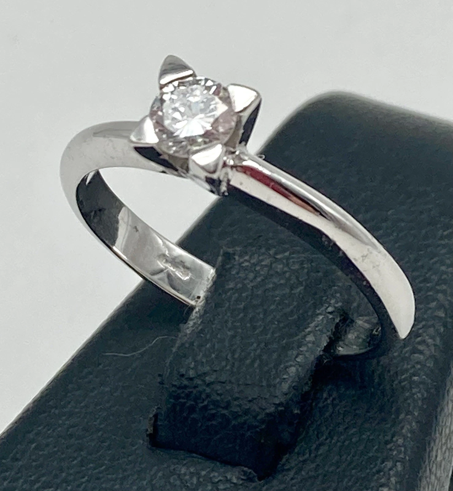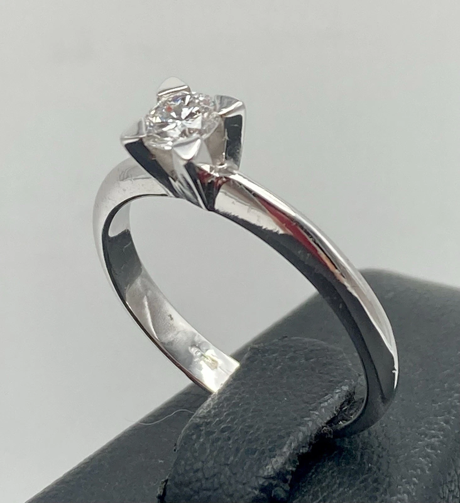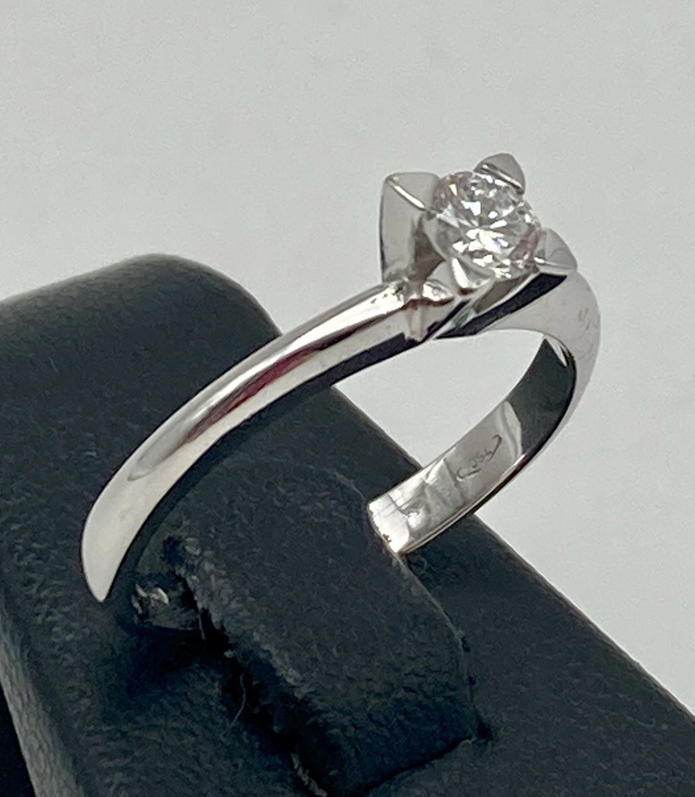 ART. 1159 “ANELLO SOLITARIO” in oro bianco 18 kt o 750 peso gr. 3,60 (totali) diamante centrale da 0,30 ct (+/-0,01) colore H (+/- 0,01) purezza VS (+/- 1) diametro interno 17,70 mm misura anello 16
