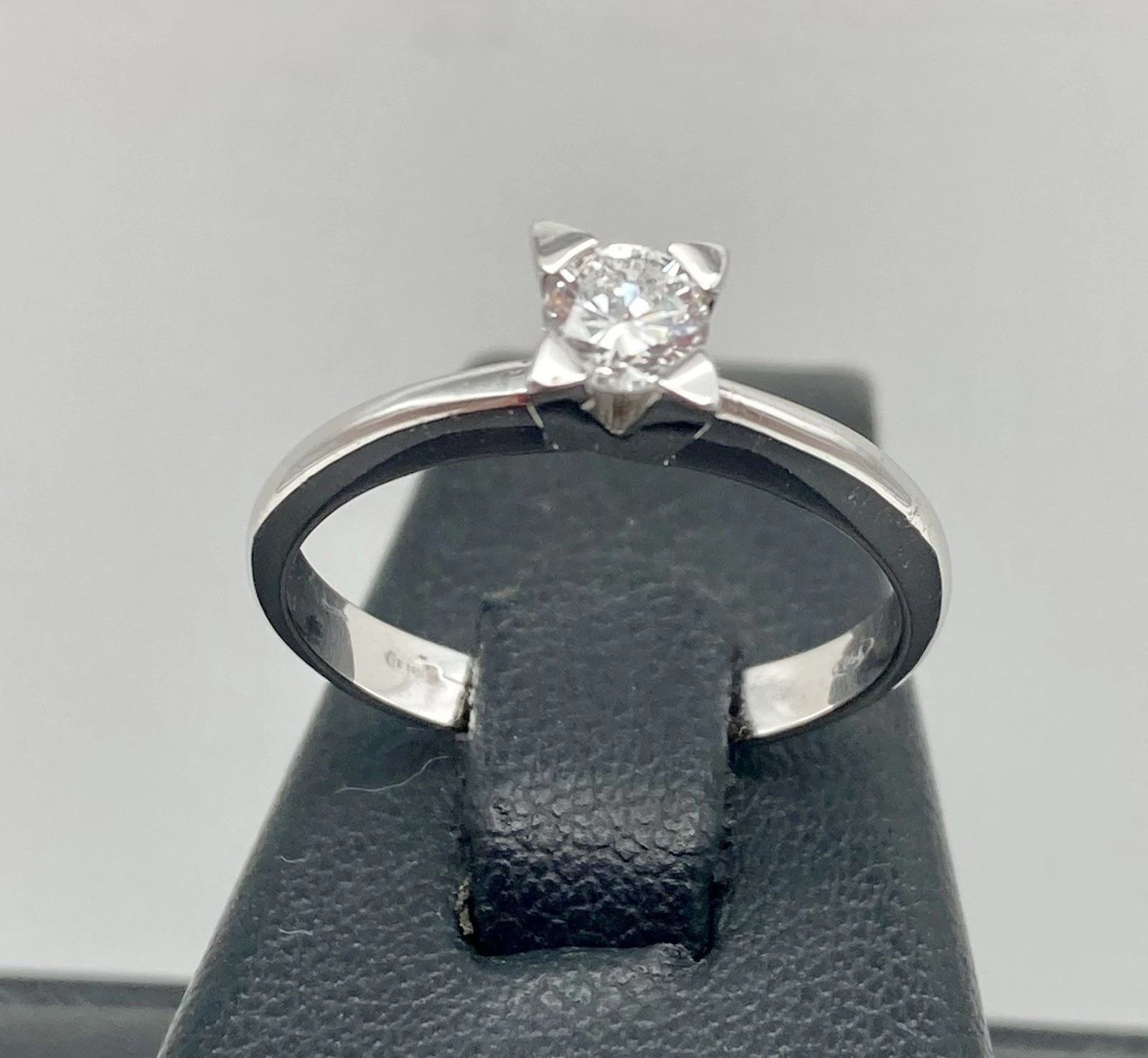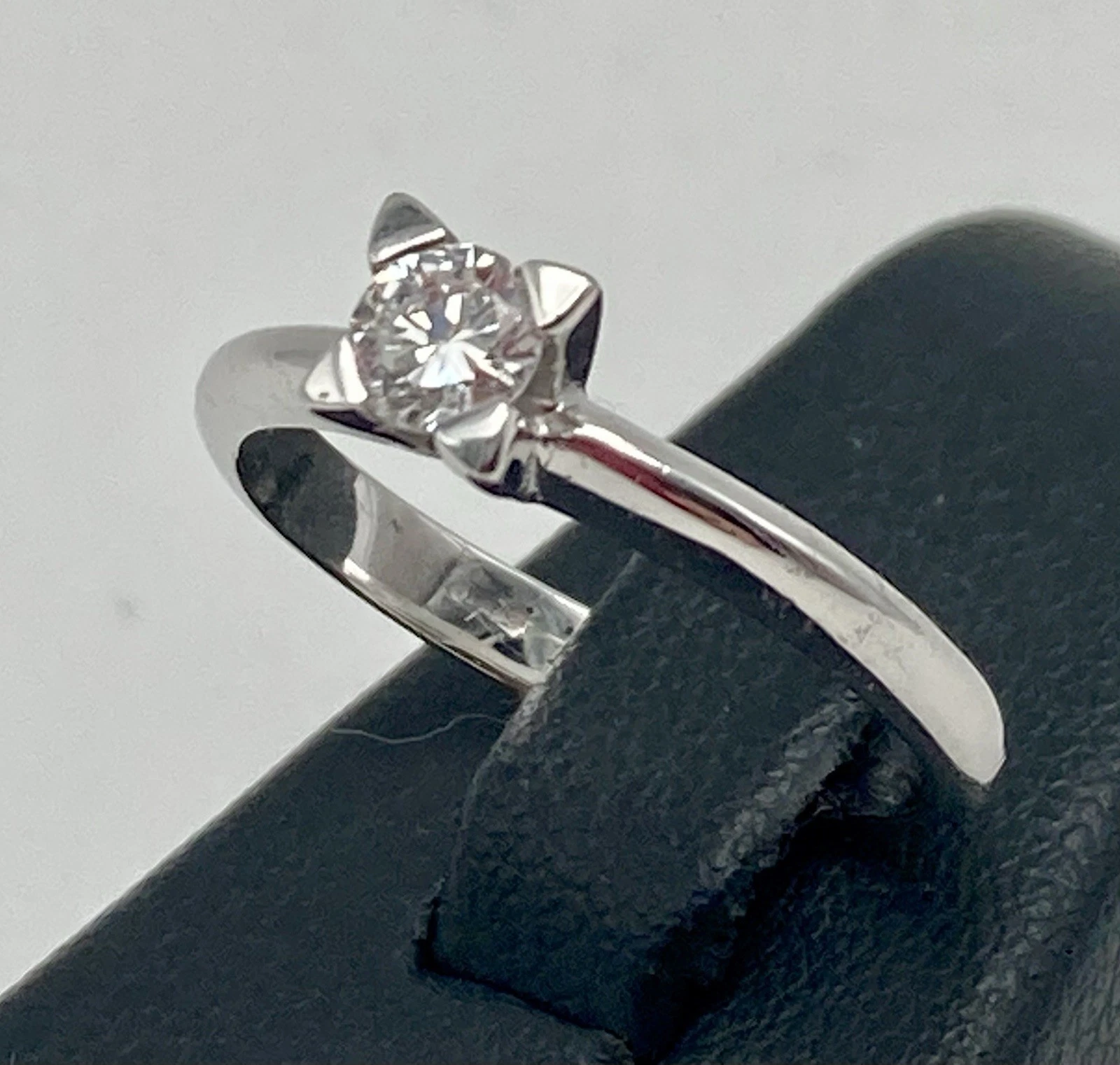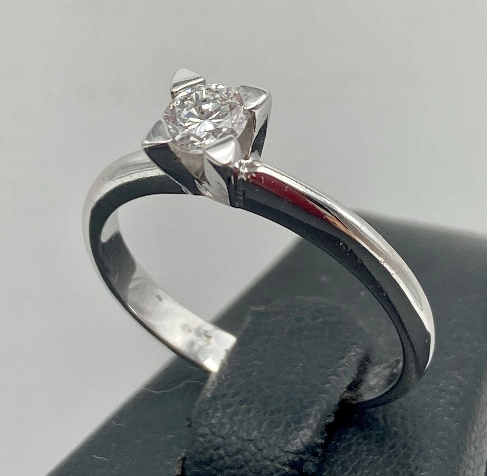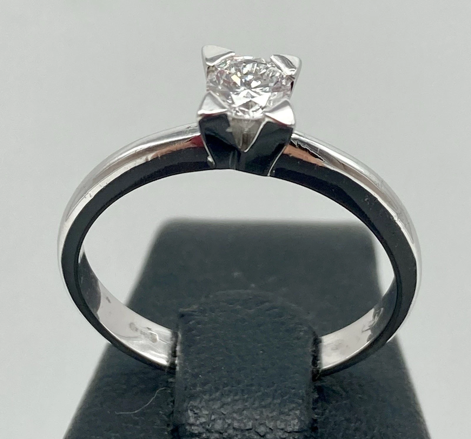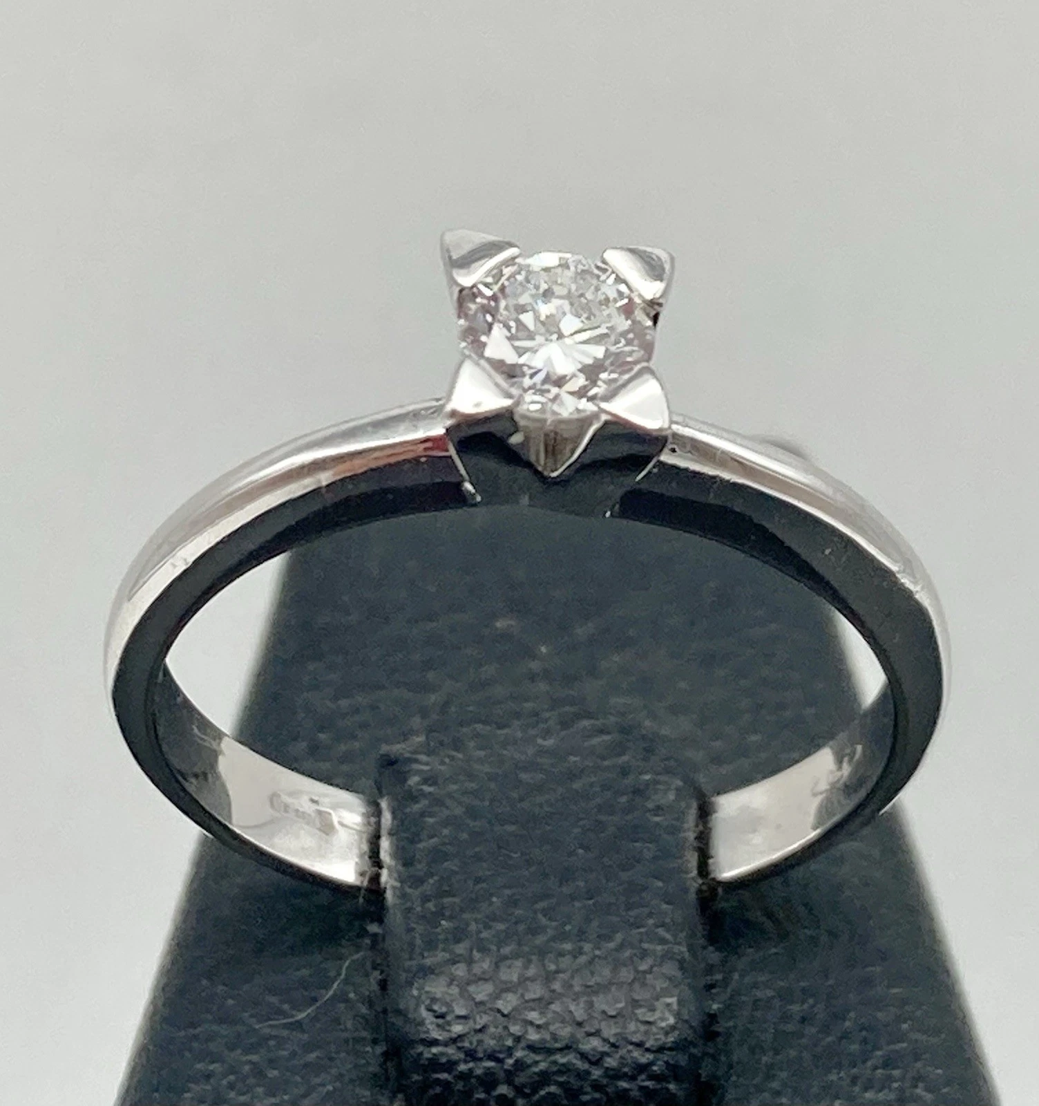 ART. 1159 “ANELLO SOLITARIO” in oro bianco 18 kt o 750 peso gr. 3,60 (totali) diamante centrale da 0,30 ct (+/-0,01) colore H (+/- 0,01) purezza VS (+/- 1) diametro interno 17,70 mm misura anello 16