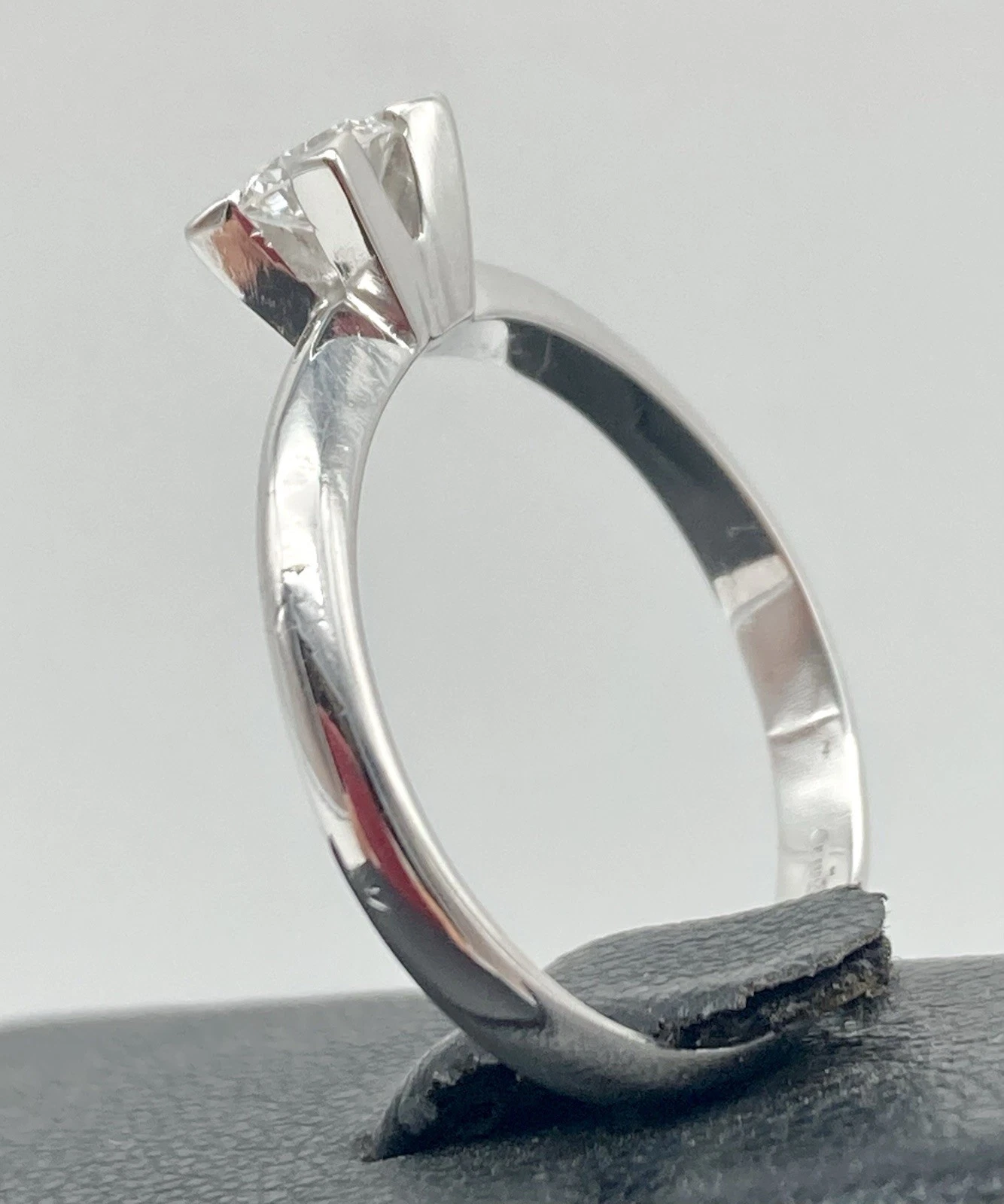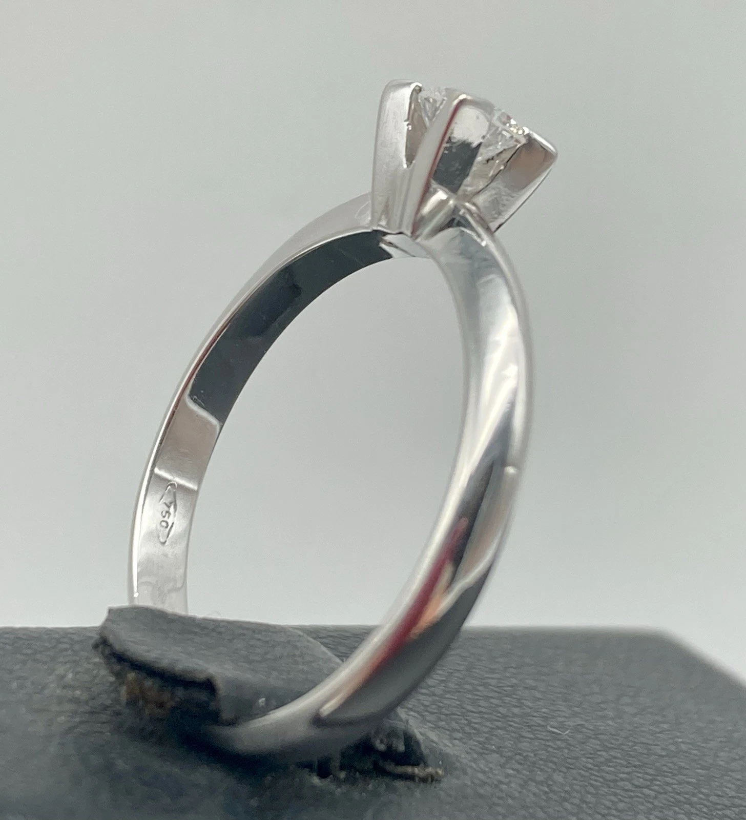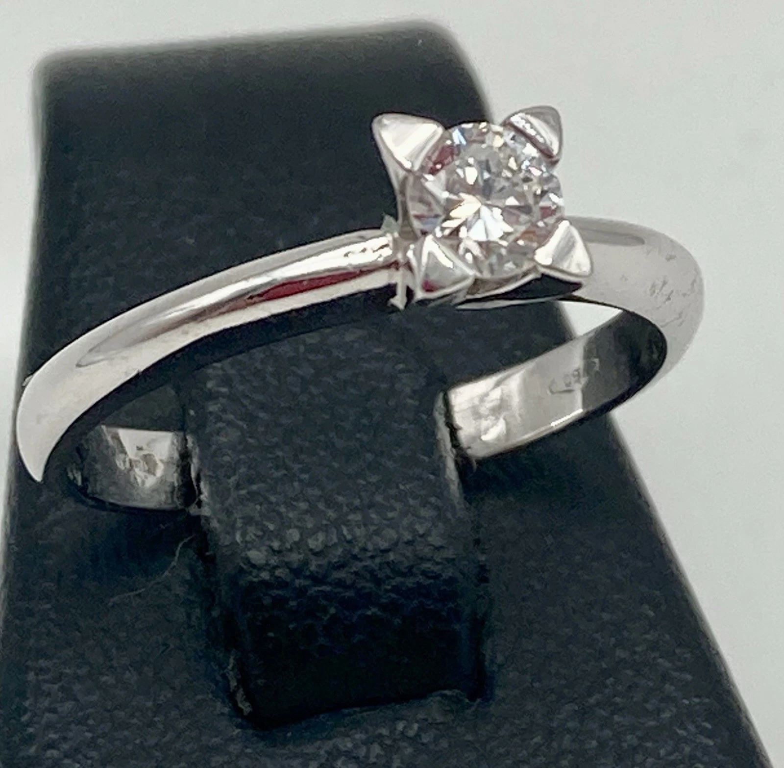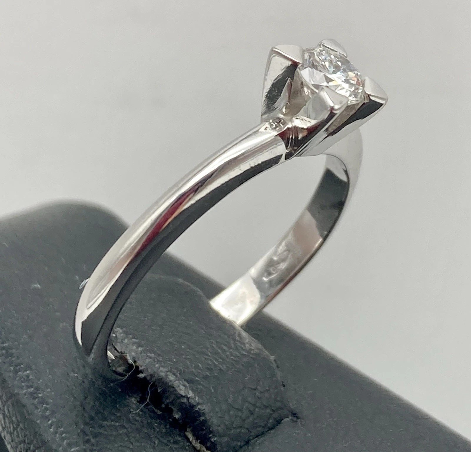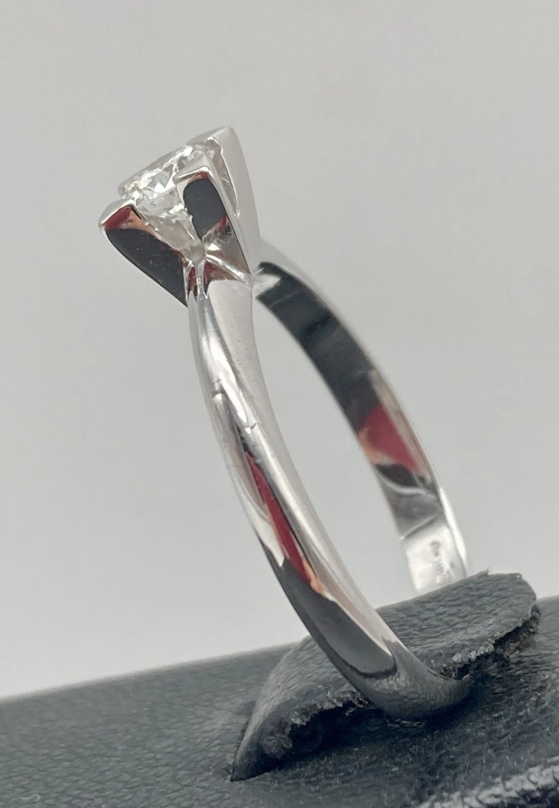 ART. 1159 “ANELLO SOLITARIO” in oro bianco 18 kt o 750 peso gr. 3,60 (totali) diamante centrale da 0,30 ct (+/-0,01) colore H (+/- 0,01) purezza VS (+/- 1) diametro interno 17,70 mm misura anello 16