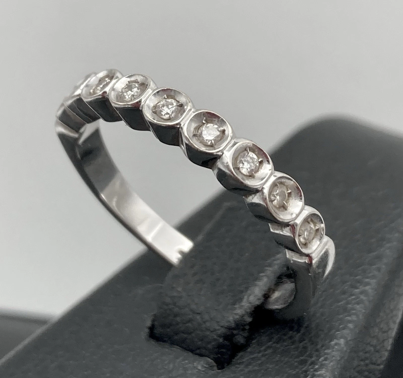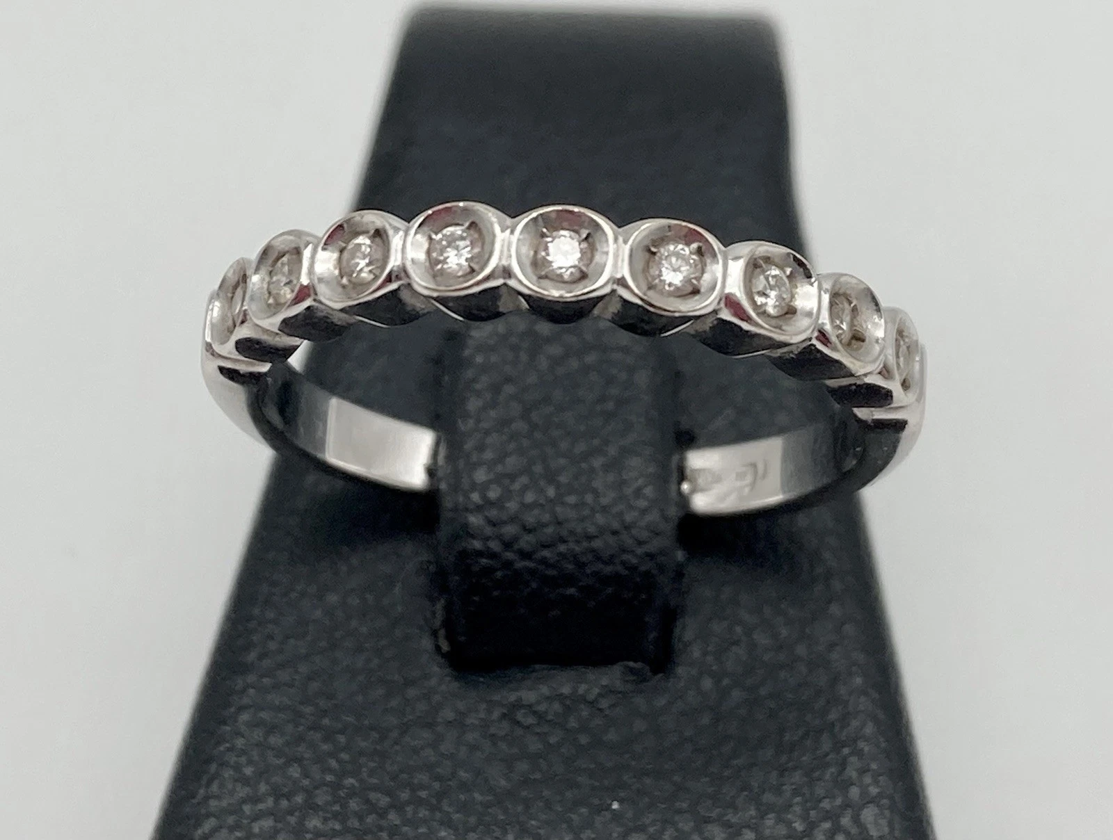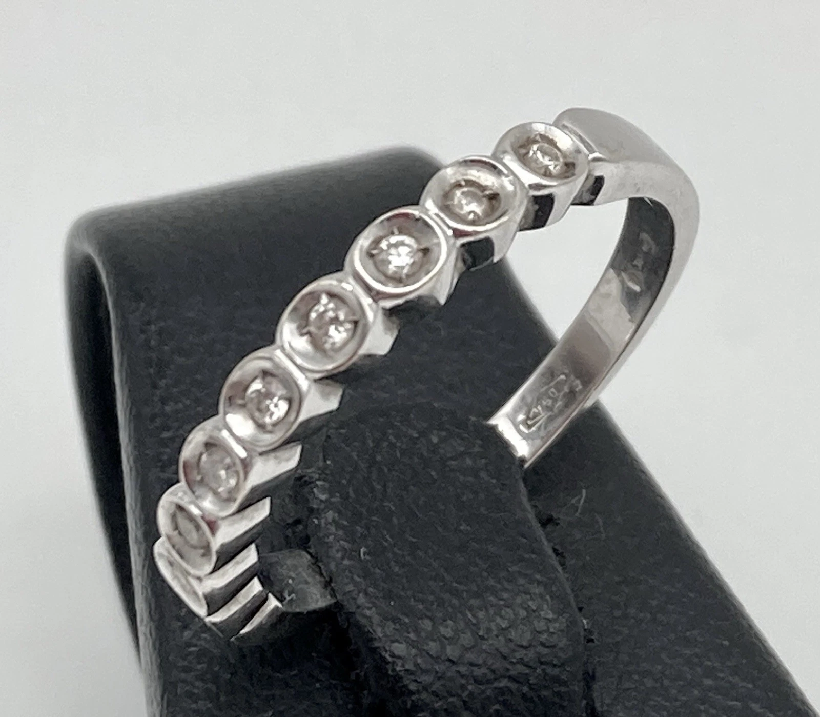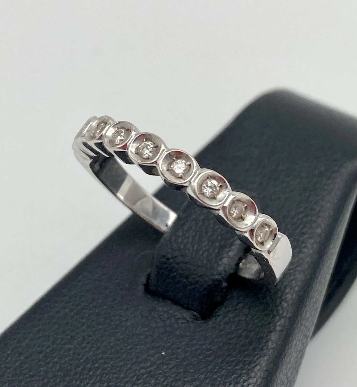 ART. SC 42 “ANELLO VERETTA” In oro bianco 18 kt o 750 peso gr. 4,20 (totali) 9 diamanti da 0,01 ct purezza VS1 (+/- 1) colore H (+/- 1) totale 0,09 ct diametro interno 18,70 mm misura anello 19
