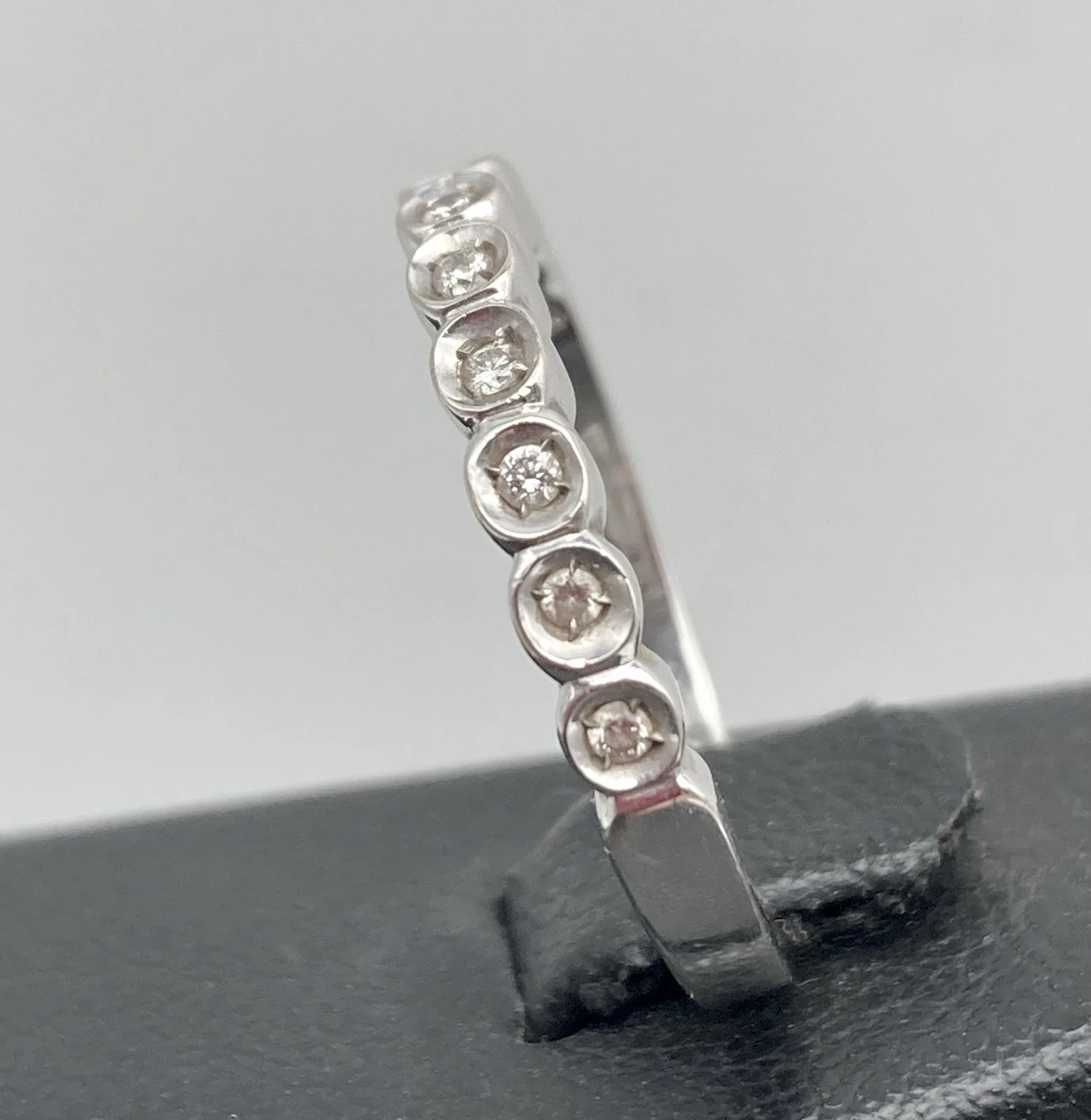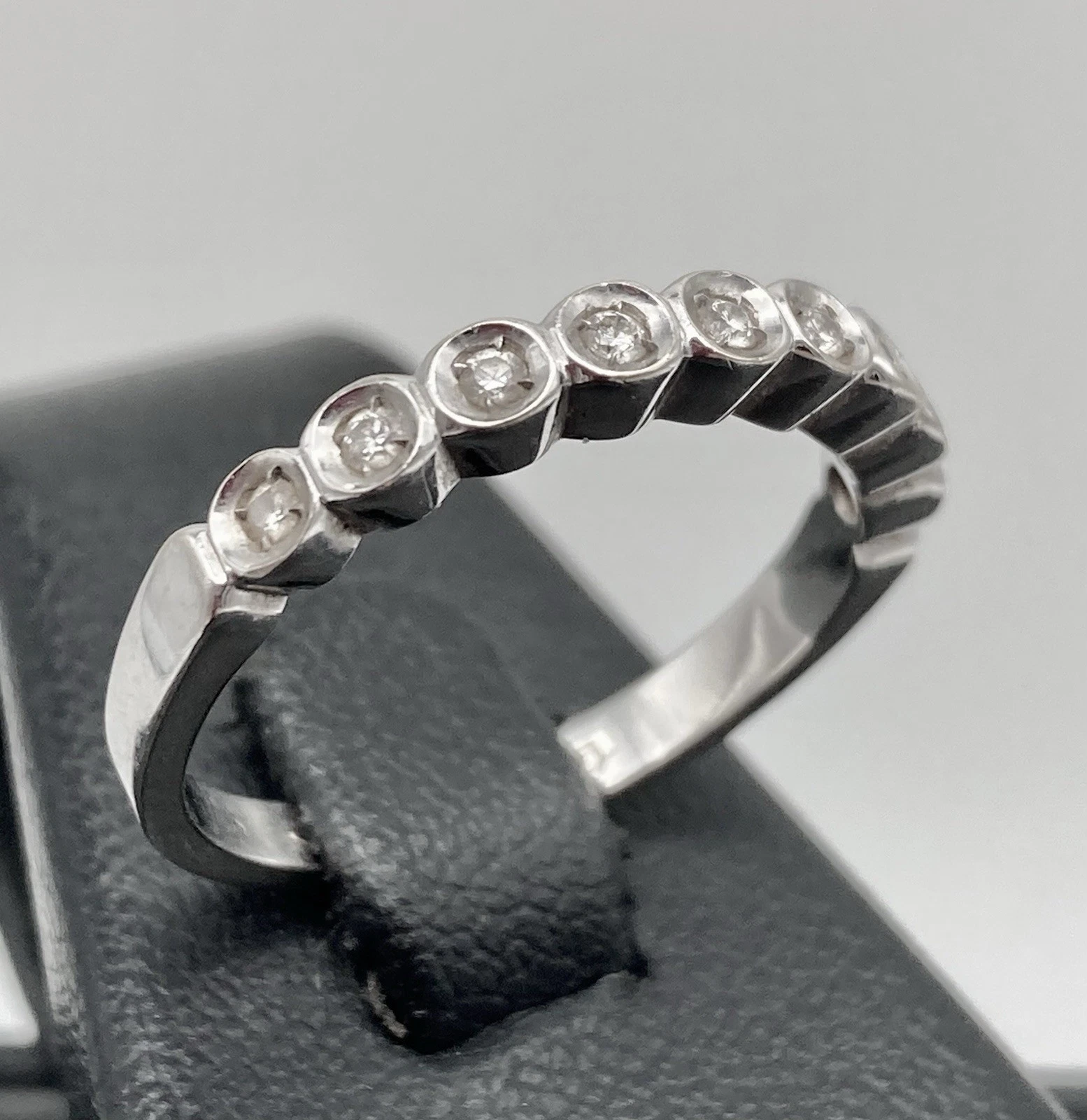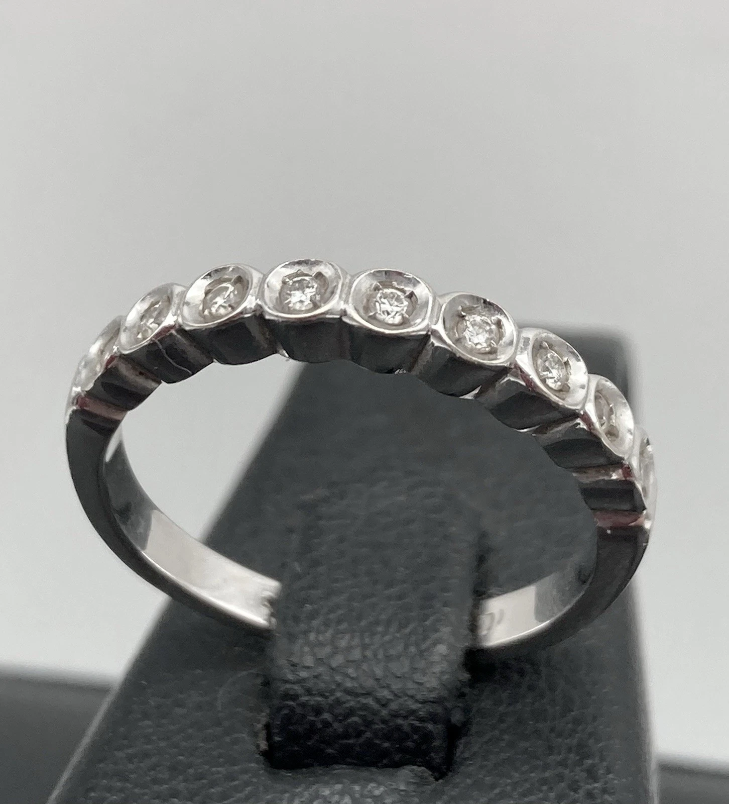 ART. SC 42 “ANELLO VERETTA” In oro bianco 18 kt o 750 peso gr. 4,20 (totali) 9 diamanti da 0,01 ct purezza VS1 (+/- 1) colore H (+/- 1) totale 0,09 ct diametro interno 18,70 mm misura anello 19