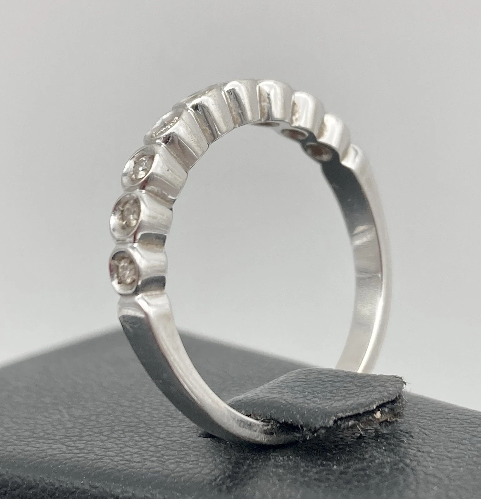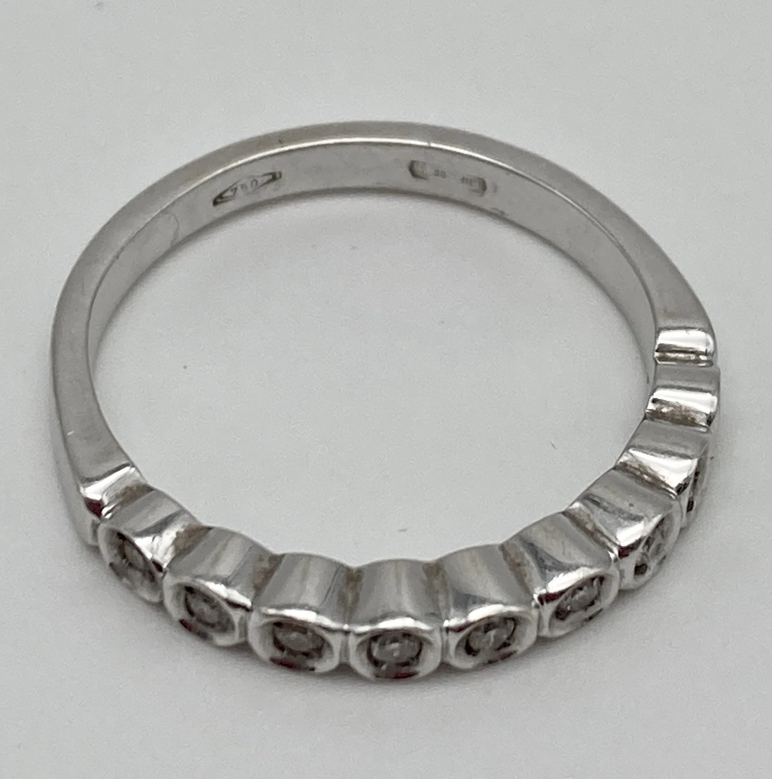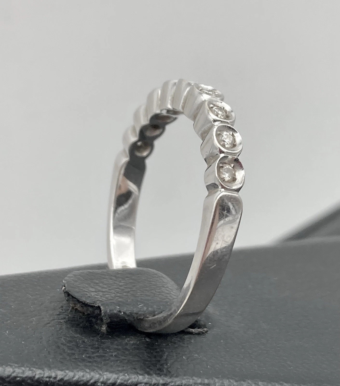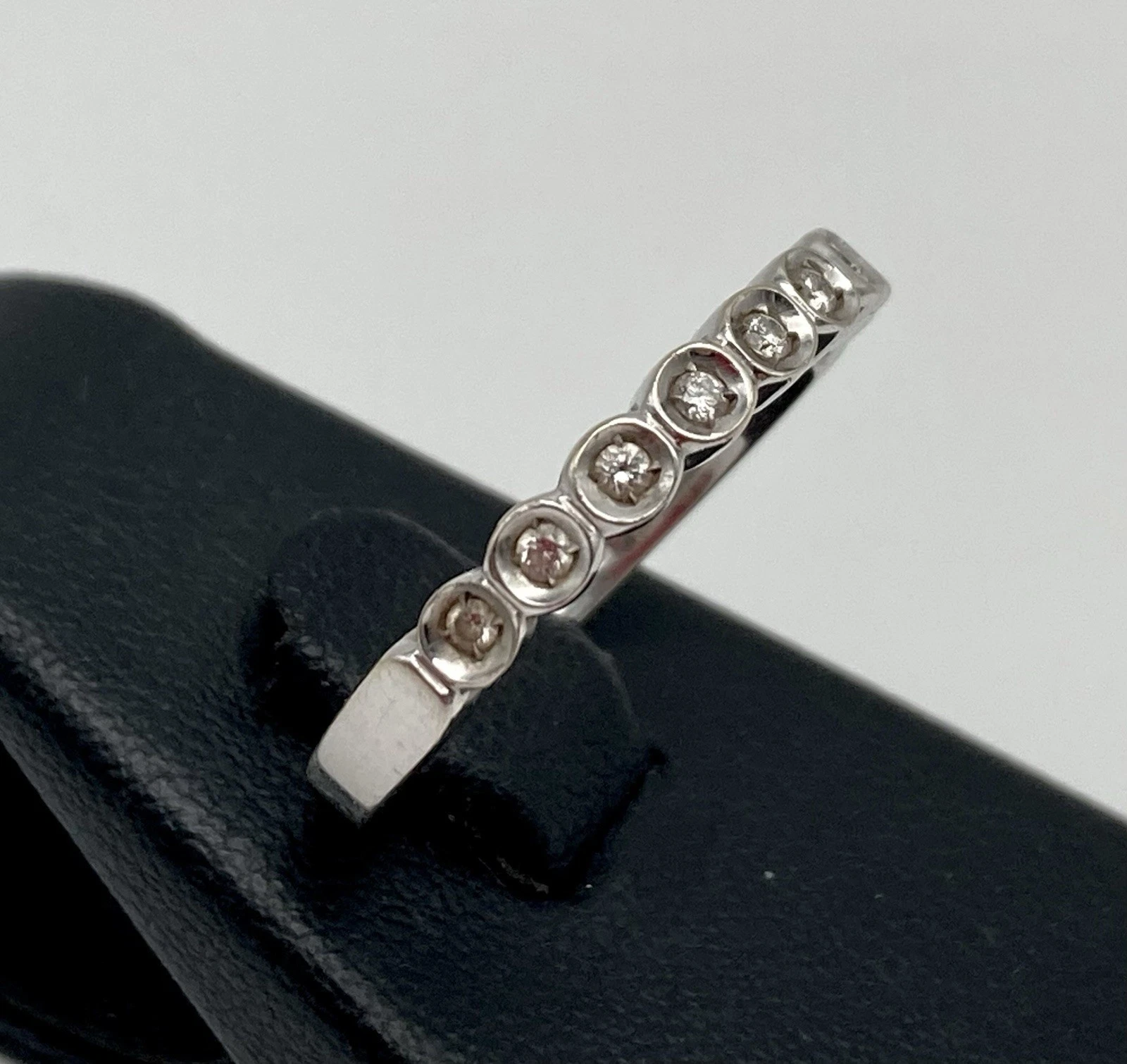 ART. SC 42 “ANELLO VERETTA” In oro bianco 18 kt o 750 peso gr. 4,20 (totali) 9 diamanti da 0,01 ct purezza VS1 (+/- 1) colore H (+/- 1) totale 0,09 ct diametro interno 18,70 mm misura anello 19