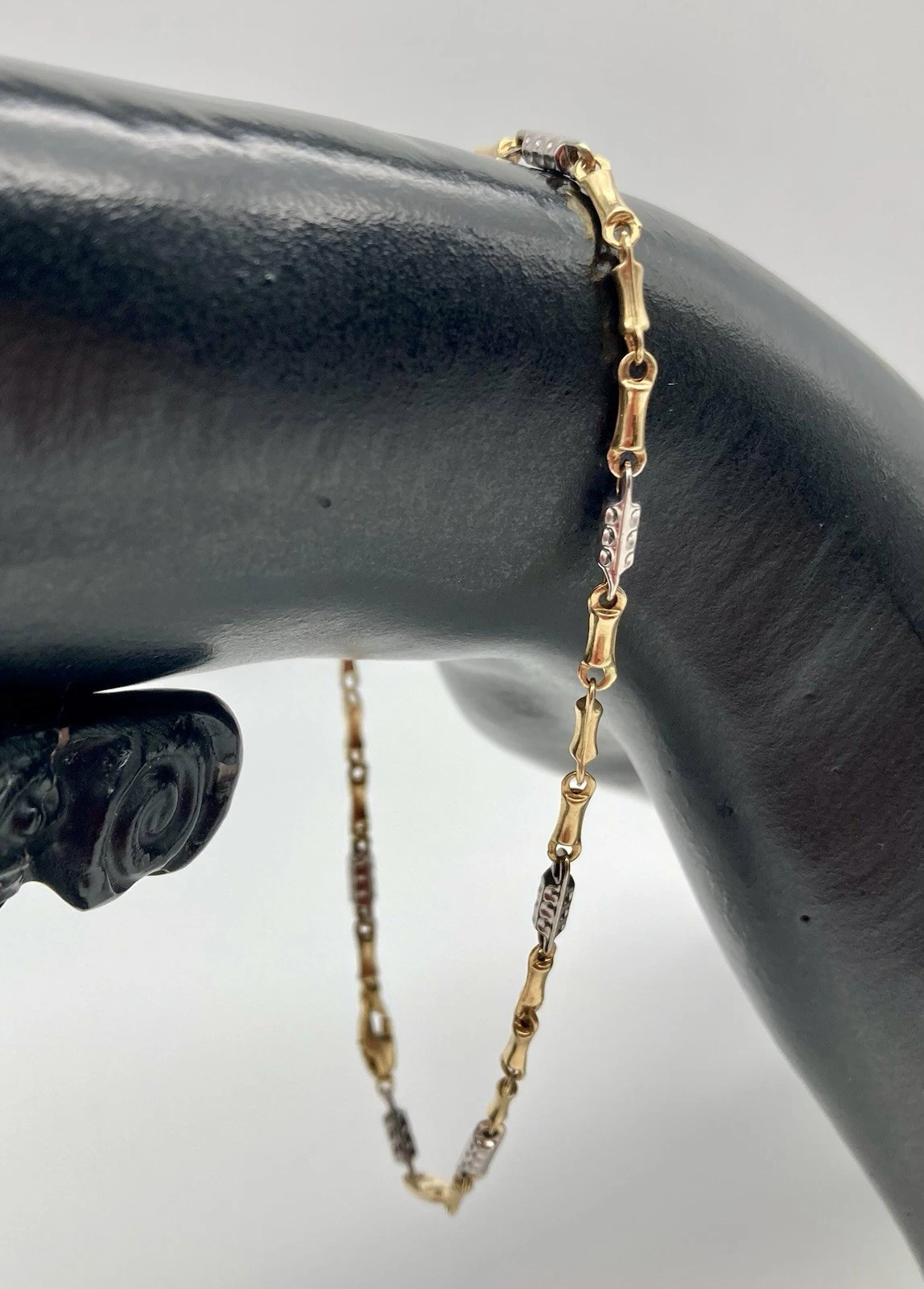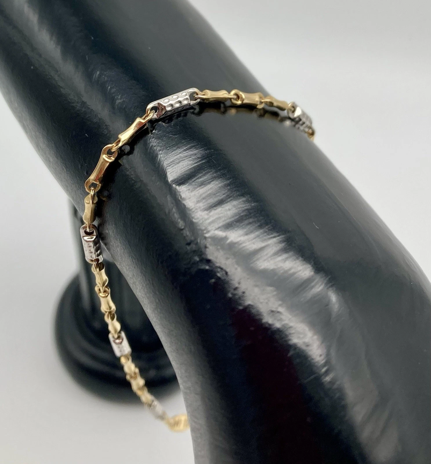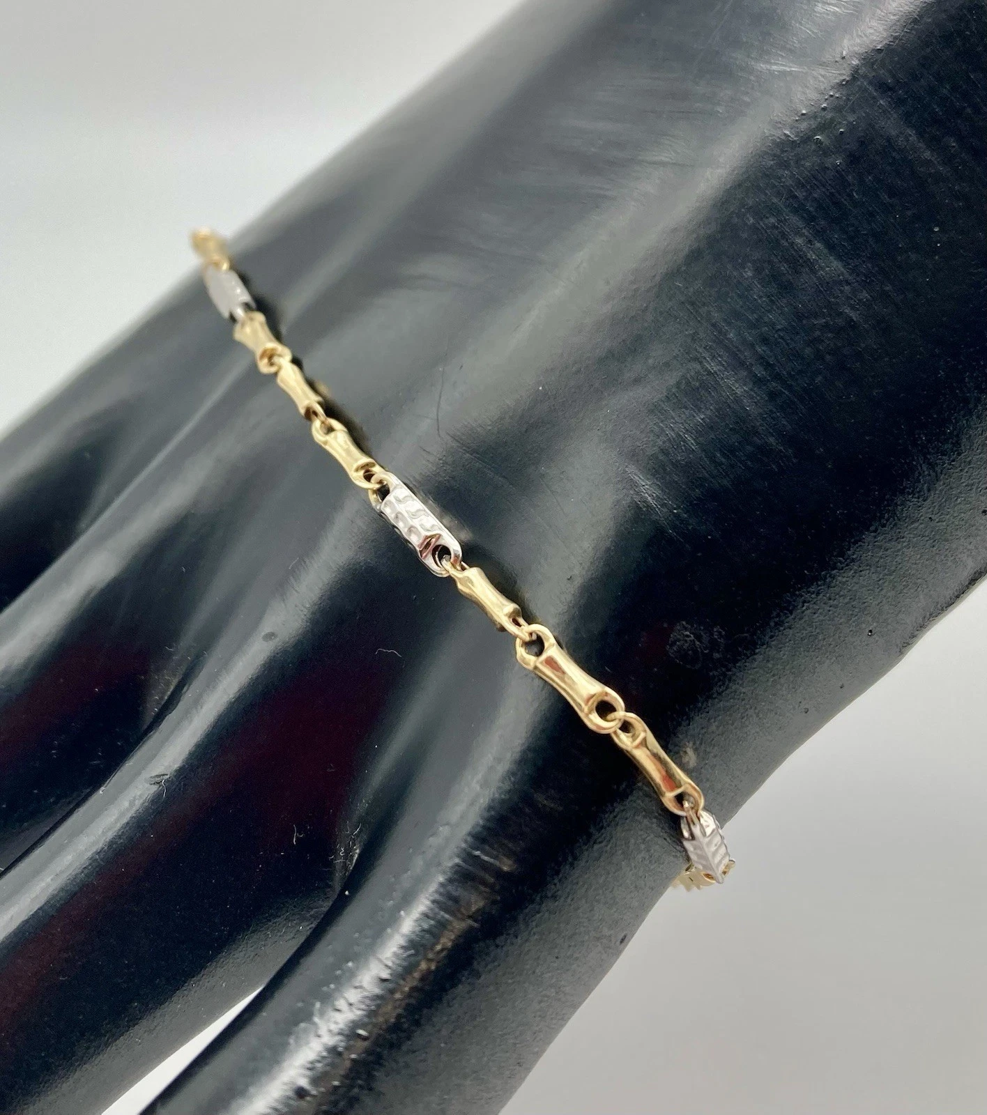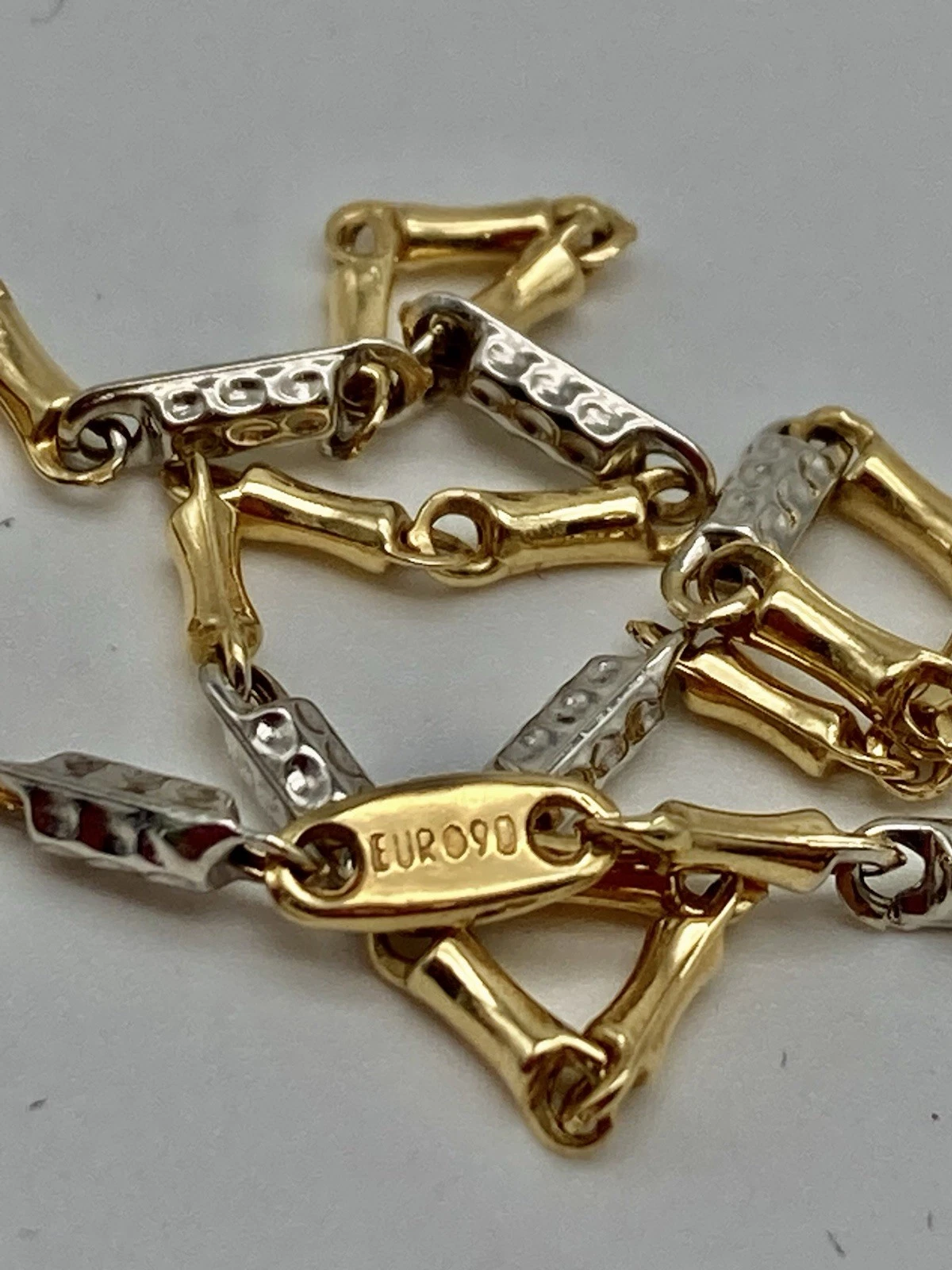 ART. 1169 “BRACCIALE 3+1” Marca EURO90 peso gr. 2,60 maglia con 3 targhette lisce in oro giallo separate da una martellata in oro bianco 18kt o 750 lunghezza bracciale 21,50 cm larghezza maglia 2,35 mm adatto a polsi M /L