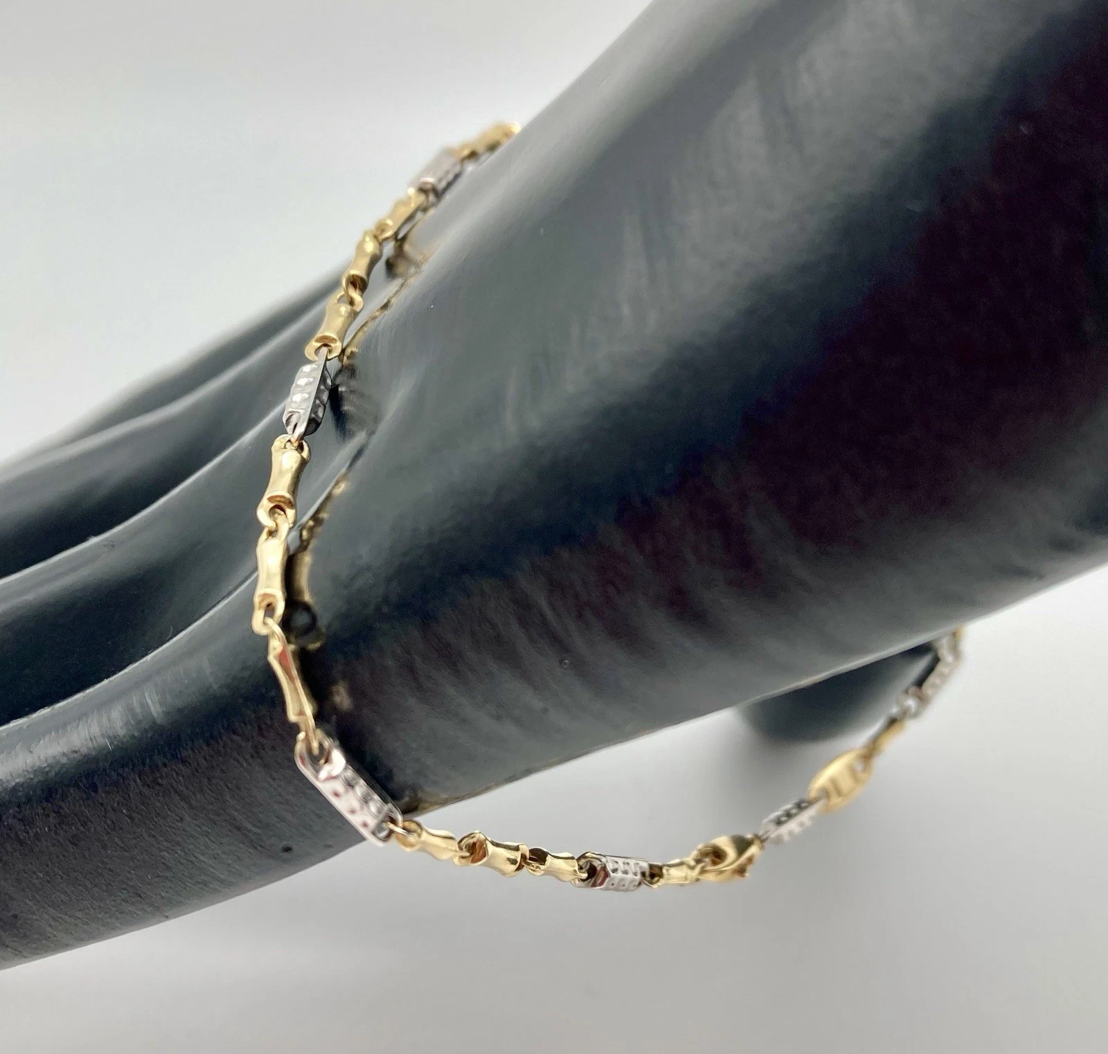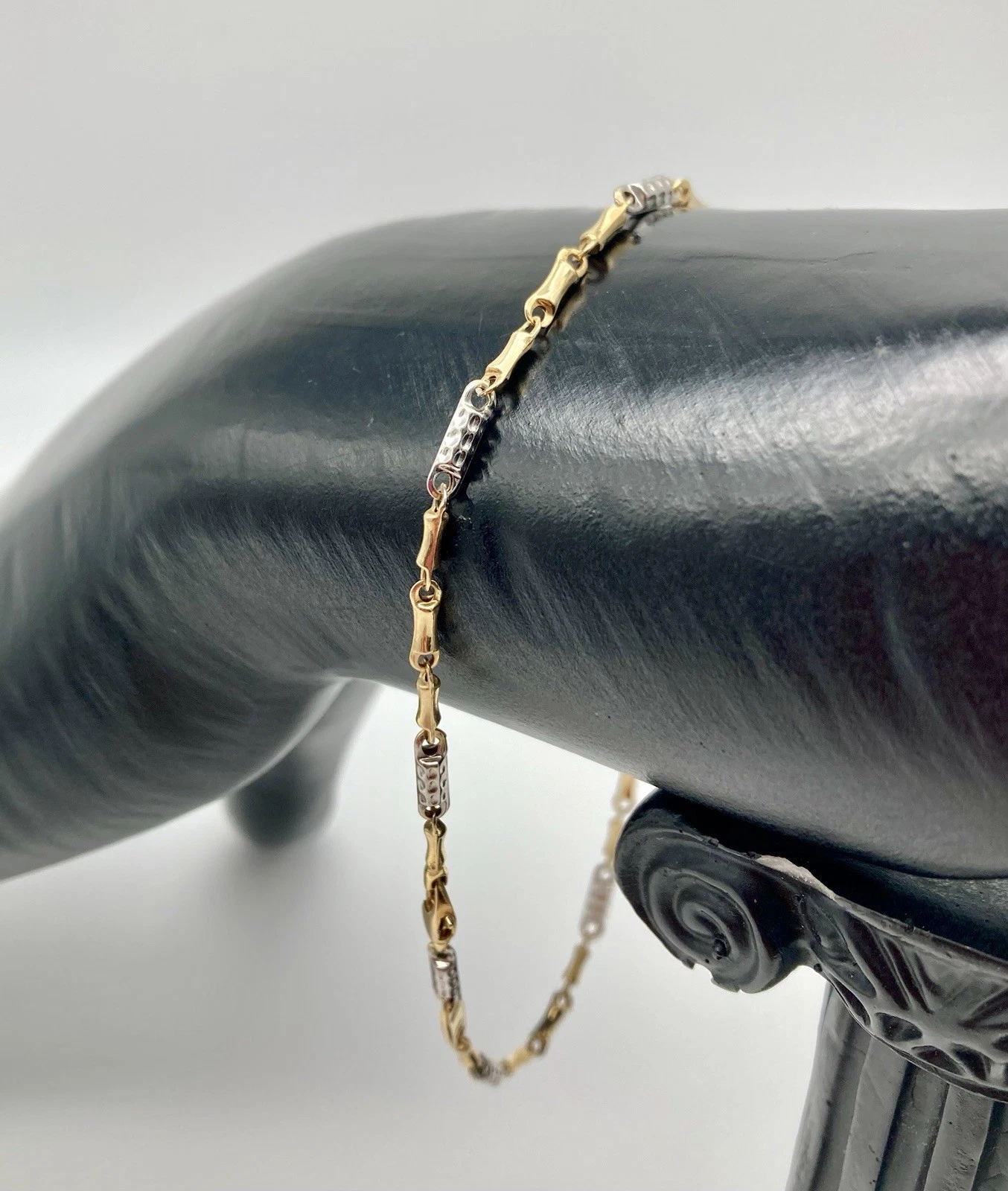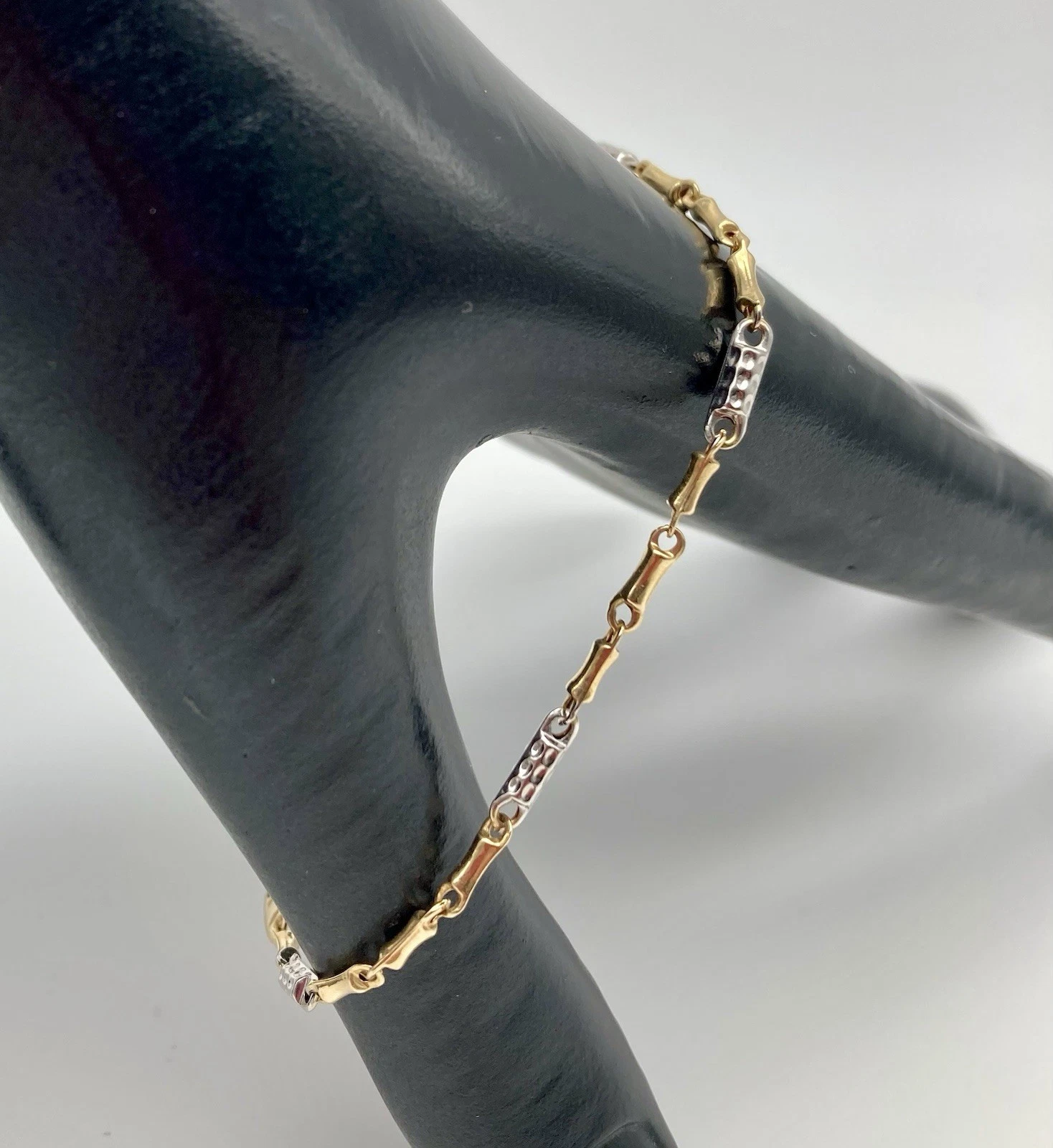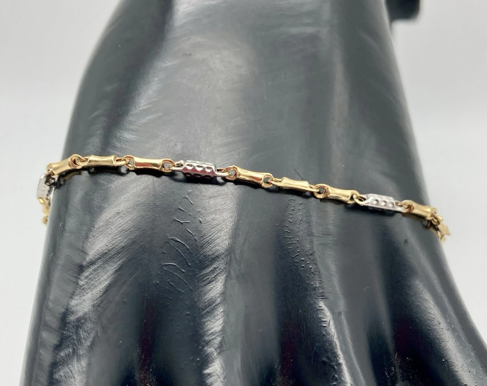 ART. 1169 “BRACCIALE 3+1” Marca EURO90 peso gr. 2,60 maglia con 3 targhette lisce in oro giallo separate da una martellata in oro bianco 18kt o 750 lunghezza bracciale 21,50 cm larghezza maglia 2,35 mm adatto a polsi M /L