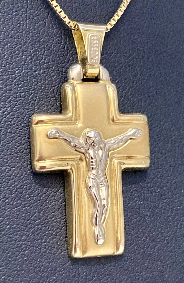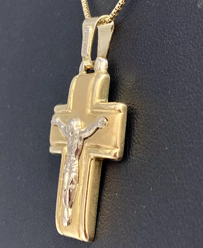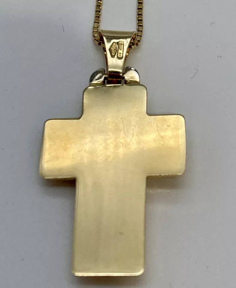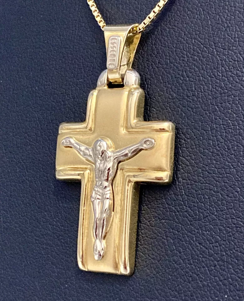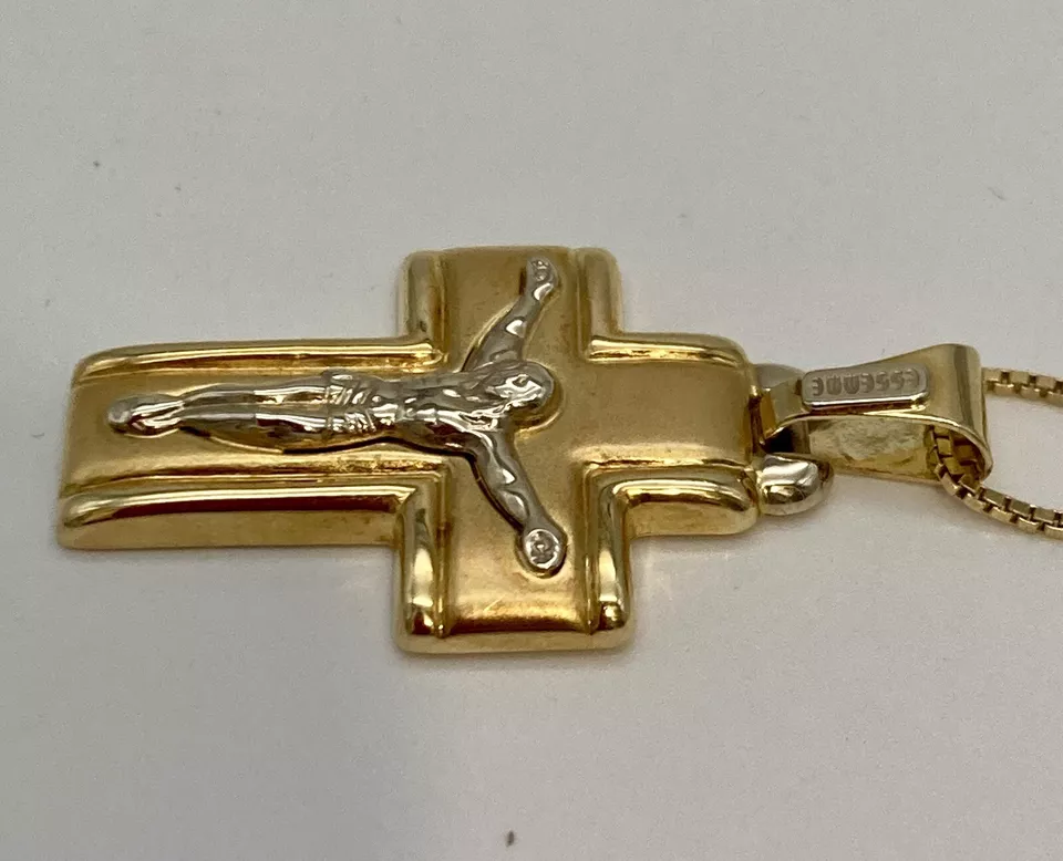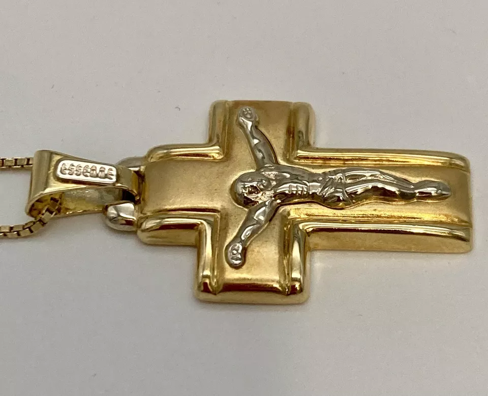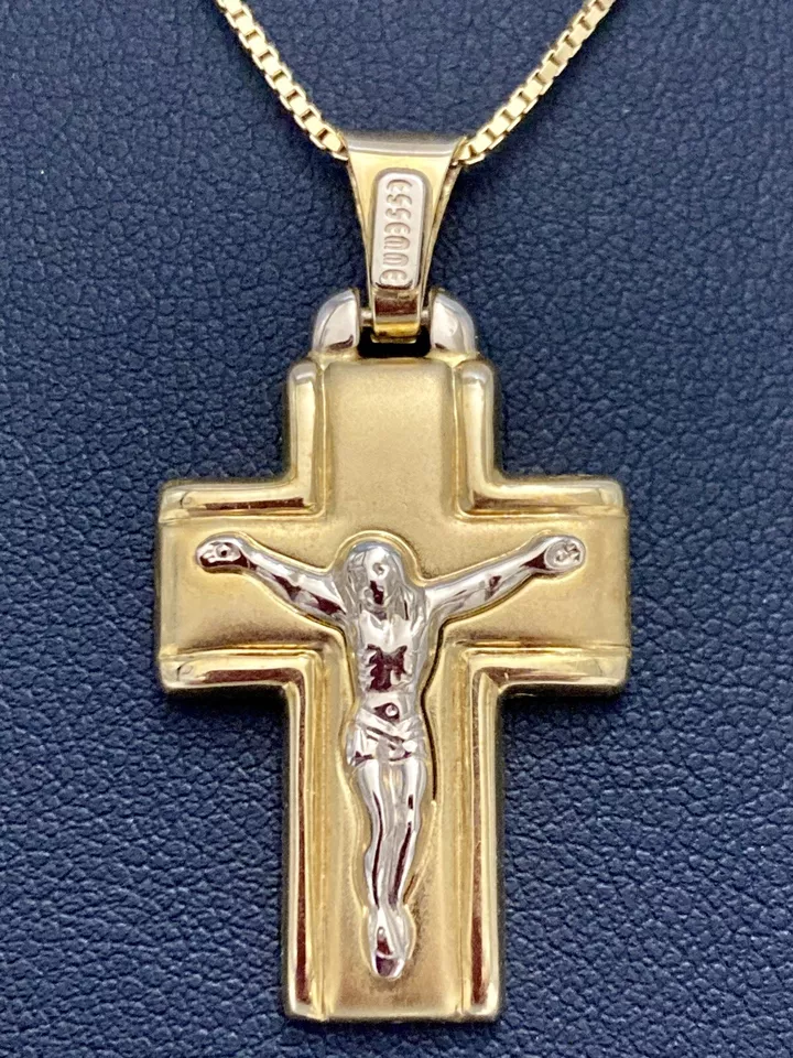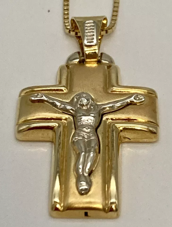 ART. 1116 “CIONDOLO CROCIFISSO” Marca “ Essemme” In oro giallo e bianco 18 kt o 750 peso gr. 4,90 croce satinata in oro giallo bordi lisci con Gesù in oro bianco larghezza 20,60 mm altezza con contromaglia 37,80 mm altezza senza contromaglia 31,50 mm larghezza interna contromaglia 3,20 mm altezza interna contromaglia 8,30 mm