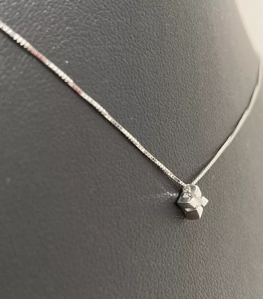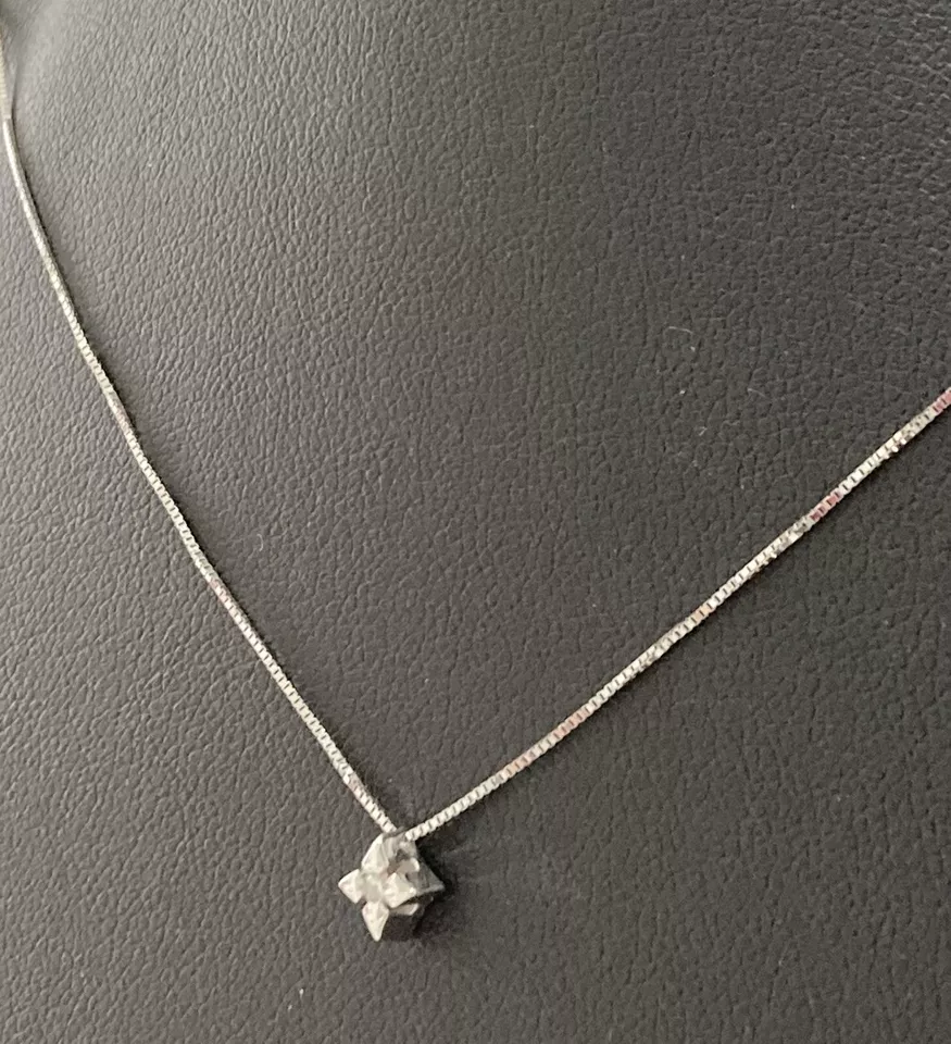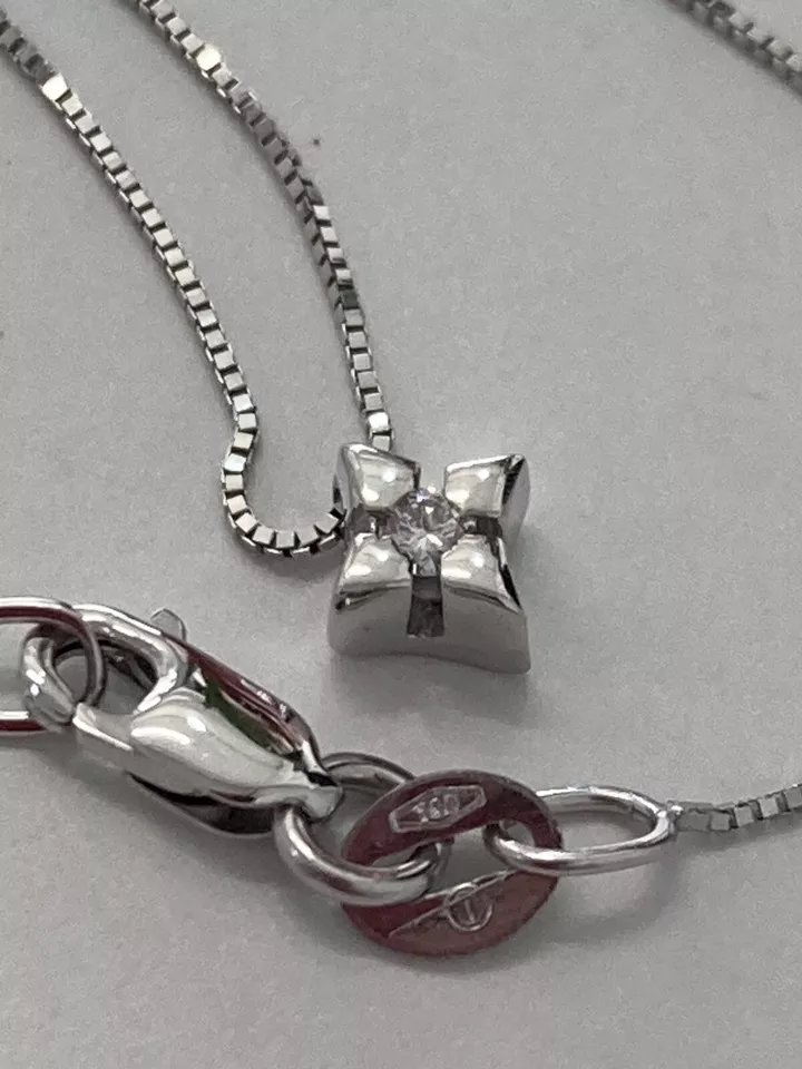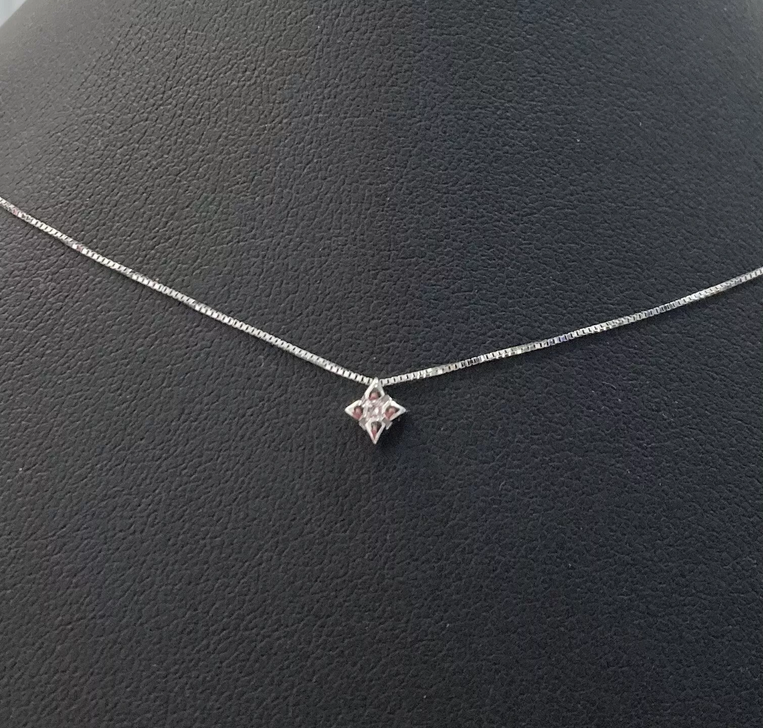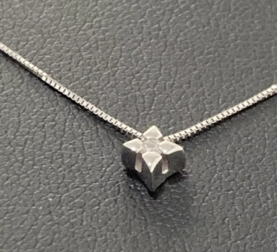 ART. 1094 “COLLANA PUNTO LUCE” Collana punto luce in oro bianco 18 kt o 750 peso gr. 1,40 (oro e diamante) maglia veneziana castone stella a quattro punte lunghezza collana 41,50 cm diamante taglio brillante 0,02 ct (+/- 0,01) purezza VS (+/- 1) colore H (+/- 1)